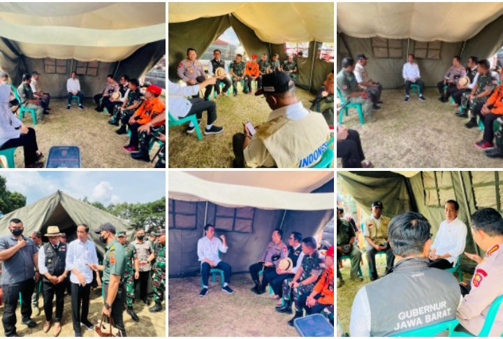 CIANJUR, JABAR | Presiden Joko Widodo menggelar rapat terbatas bersama jajarannya di lokasi pengungsian korban gempa Cianjur di Taman Prawatasari, Kabupaten Cianjur, Provinsi Jawa Barat, pada Selasa, 22 November 2022. Dalam rapat yang digelar secara mendadak tersebut, Presiden antara lain menginstruksikan jajarannya untuk segera membuka daerah terisolasi.