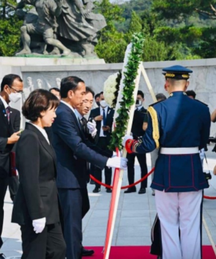 Setelah prosesi selesai, Presiden Jokowi menandatangani buku tamu lalu meninggalkan Taman Makam Nasional Seoul. Presiden Jokowi menuju Kantor Kepresidenan Yongsan untuk bertemu dengan Presiden Korea Selatan Yoon Suk-yeol.