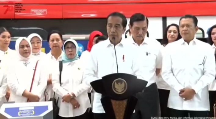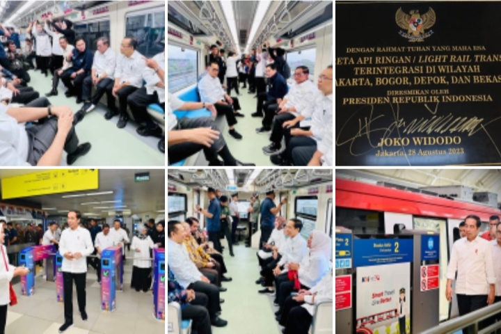 JAKARTA – Presiden Joko Widodo meresmikan moda transportasi kereta api ringan Lintas Rel Terpadu (LRT) Jakarta-Bogor-Depok-Bekasi (Jabodebek) di Stasiun LRT Cawang, Jakarta pada Senin, 28 Agustus 2023. LRT sepanjang 41,2 kilometer tersebut dibangun dengan menghabiskan anggaran Rp32,6 triliun.