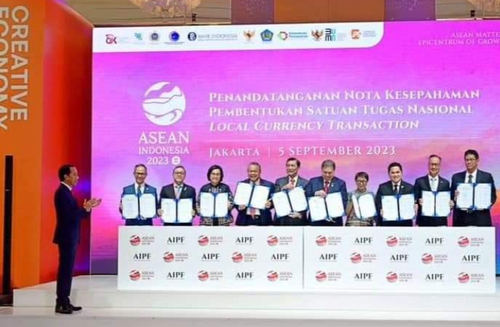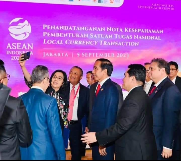 infoindonesiainews.com | JAKARTA –Di sela-sela Konferensi Tingkat Tinggi (KTT) Ke-43 ASEAN, Presiden Joko Widodo menyaksikan penandatanganan Nota Kesepahaman tentang Kerja Sama dan Koordinasi dalam rangka Peningkatan Penggunaan Mata Uang Lokal dalam Transaksi Indonesia dengan Negara Mitra. Acara penandatangan dilakukan oleh Satuan Tugas (Satgas) Nasional Local Currency Transaction (LCT) atau transaksi mata uang lokal di Hotel Mulia, Jakarta, pada Selasa, 5 September 2023.