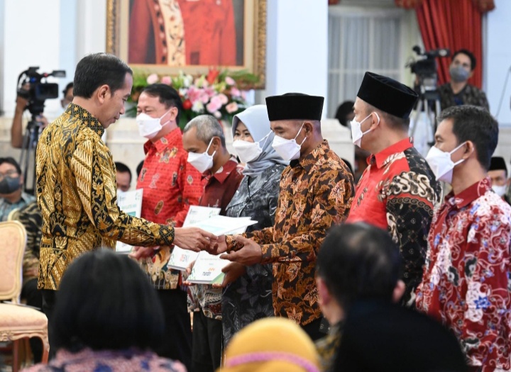 JAKARTA | Presiden Joko Widodo menyerahkan kredit usaha rakyat (KUR) klaster dan menyalurkan dana melalui Lembaga Pengelola Dana Bergulir Koperasi dan Usaha Mikro, Kecil, dan Menengah (LPDB KUMKM) di Istana Negara, Jakarta, pada Senin, 19 Desember 2022. Pada kesempatan tersebut, Presiden menyerahkan KUR klaster dan menyalurkan dana melalui LPDB KUMKM kepada sejumlah perwakilan penerima yang hadir di Istana Negara.