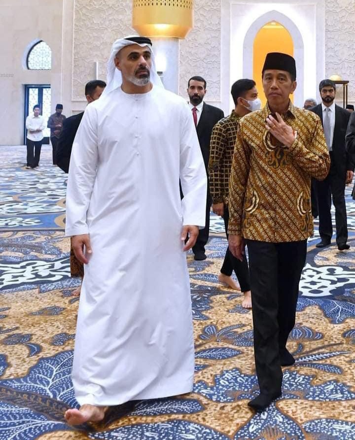 Saat tiba di Masjid Raya Sheikh Zayed, Sheikh Khalid MBZ langsung disambut oleh Presiden Joko Widodo. Sheikh Khalid MBZ tampak didampingi oleh Menteri Energi PEA, Suhail bin Mohammed Al Mazrouei.