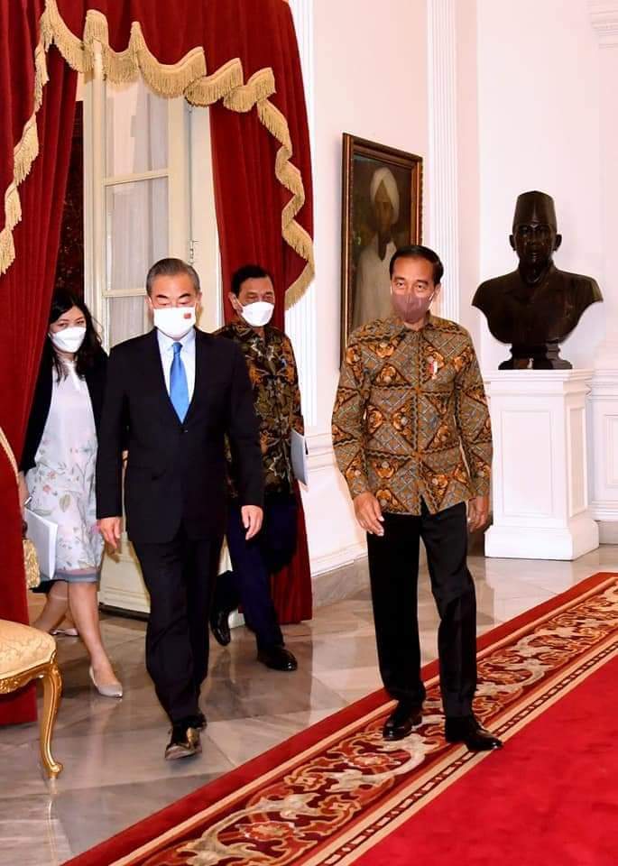 JAKARTA | Presiden Joko Widodo menerima kunjungan Menteri Luar Negeri (Menlu) Republik Rakyat Tiongkok (RRT) Wang Yi beserta delegasi di Istana Merdeka, Jakarta, pada Senin, 11 Juli 2022. Menteri Luar Negeri Retno Marsudi yang turut mendampingi Presiden Jokowi dalam pertemuan tersebut mengatakan bahwa RRT mengapresiasi pemerintah Indonesia dalam mengupayakan resolusi damai terhadap situasi yang terjadi di Ukraina.