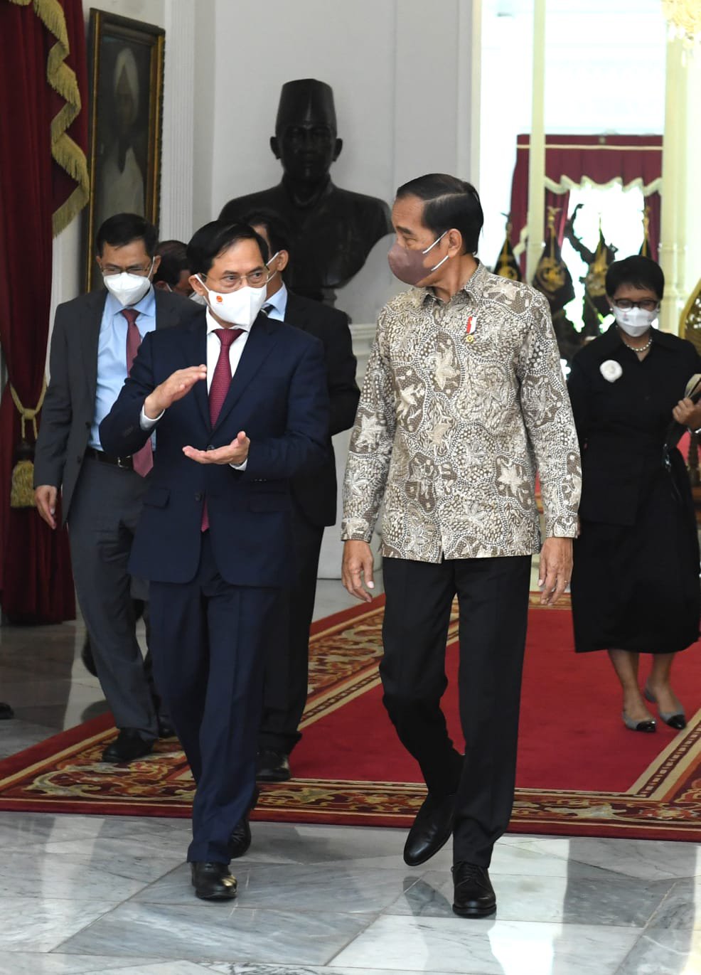 JAKARTA | Presiden Joko Widodo menerima kunjungan kehormatan Menteri Luar Negeri (Menlu) Vietnam, Bui Thanh Son, dan delegasi di Istana Merdeka, Jakarta, pada Rabu, 20 Juli 2022. Dalam pertemuan tersebut, Presiden Jokowi memberikan tiga arahan kepada Menlu Indonesia Retno Marsudi yang akan melakukan pertemuan komisi bersama dengan Menlu Vietnam.