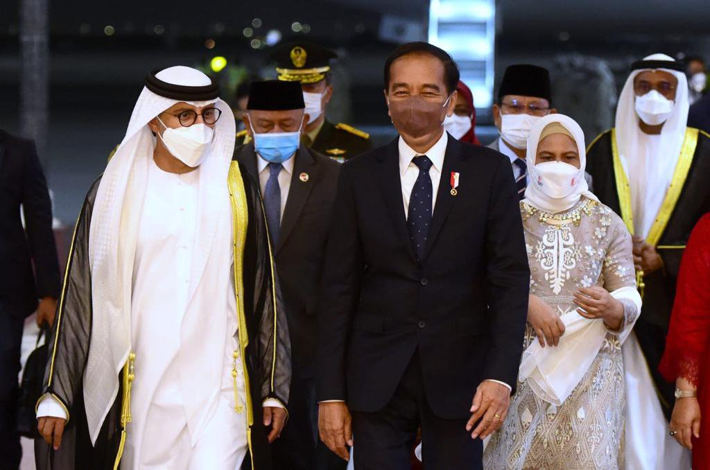 Saat turun dari pesawat, Presiden dan Ibu Iriana disambut oleh Menteri Energi dan Infrastruktur PEA Suhail Mohammed Al Mazroei, Duta Besar RI untuk PEA Husin Bagis beserta istri, Duta Besar PEA untuk Indonesia Abdullah Aldhaheri, Menteri Pertahanan Prabowo Subianto, dan Atase Pertahanan di KBRI Riyadh, Brigjen TNI Putut Witjaksono Hadi beserta istri.