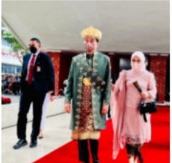 Sementara itu, Ibu Iriana tampil anggun dengan mengenakan kebaya berwarna pink lengkap dengan hijab berwarna senada. Penampilan Ibu Iriana tersebut dilengkapi dengan kain batik berwarna cokelat.