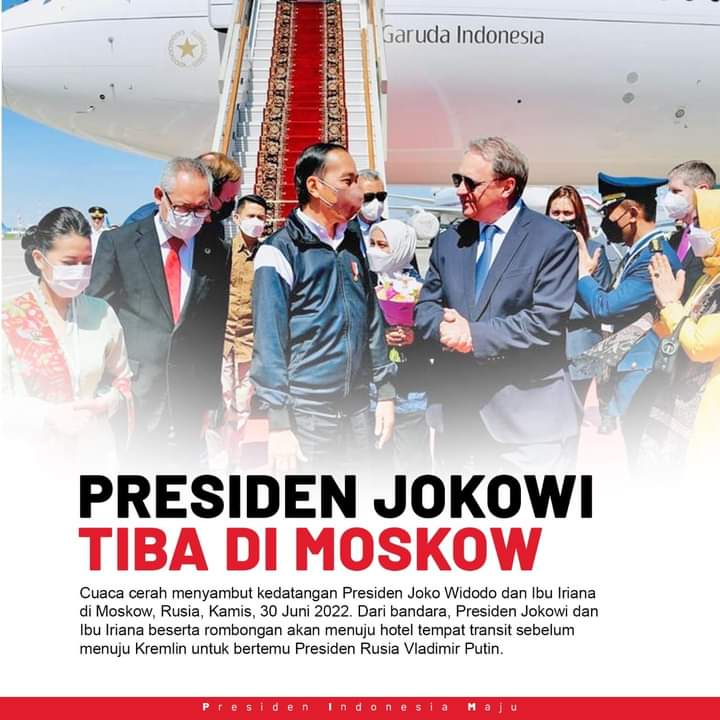 MOSKOW | Cuaca cerah menyambut kedatangan Presiden Joko Widodo dan Ibu Iriana di Moskow, Rusia, Kamis, 30 Juni 2022. Pesawat Garuda Indonesia GIA-1 yang membawa Presiden dan rombongan mendarat di Bandara Vnukovo II sekitar pukul 11.00 waktu setempat.