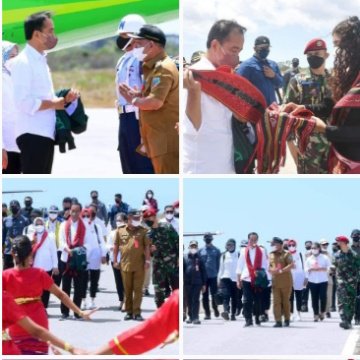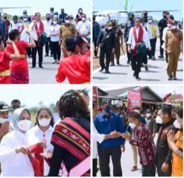 Presiden Joko Widodo dan Ibu Iriana Joko Widodo tiba di Bandar Udara Jos Orno Imsula, Werwaru, Kecamatan Moa Lakor, Kabupaten Maluku Barat Daya (MBD), Provinsi Maluku pada Kamis, 15 September 2022. Kedatangan Presiden dan Ibu Iriana disambut oleh Tarian Selamat Datang “Tari Pedang”.