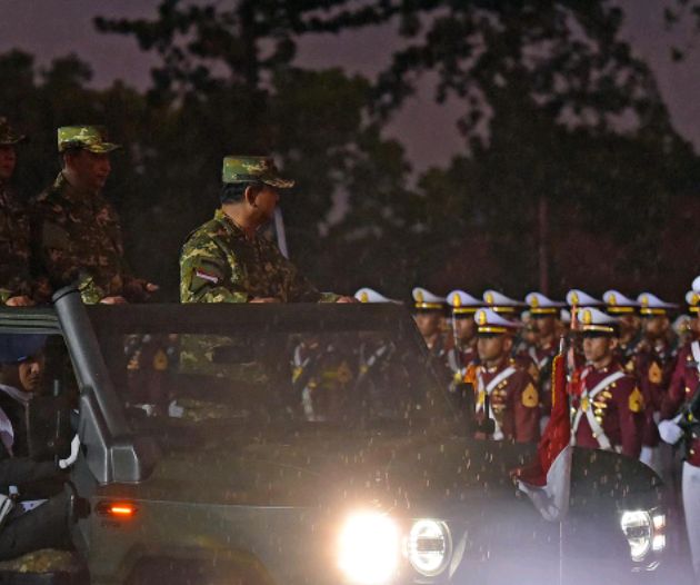 Presiden Prabowo melakukan pengecekan barisan didampingi Menteri Pertahanan Sjafrie Syamsuddin, Panglima TNI Jenderal Agus Subiyanto, dan Kepala Kepolisian Negara Republik Indonesia (Kapolri) Jenderal Listyo Sigit Prabowo, dengan menggunakan mobil Pindad Maung 1.