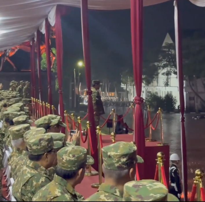 Hujan yang mengguyur tidak menyurutkan peserta upacara untuk melaksanakan seluruh rangkaian Parade Senja. Presiden dan Wakil Presiden beserta jajaran Kabinet Merah Putih tampak menggunakan seragam loreng.