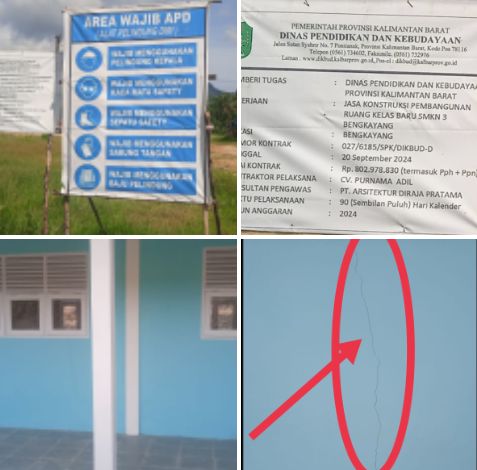 INFOINDONESIAINEWS.COM | BENGKAYANG, dan KALBAR – Proyek pembangunan ruang kelas baru di SMKN 3 Bengkayang yang berada di Desa Cipta Karya, Kecamatan Sungai Betung, Kabupaten Bengkayang, diduga bermasalah. Proyek yang berada di bawah Dinas Pendidikan dan Kebudayaan Provinsi Kalimantan Barat ini memiliki nilai kontrak sebesar Rp802.978.830. Dengan nomor kontrak 027/6185/SPK/dikbud-d tertanggal 20 September 2024, proyek ini dikerjakan oleh kontraktor CV. Punnama Adil dan diawasi oleh PT. Arsitektur Diraja Pratama,(16 Desember 2024).