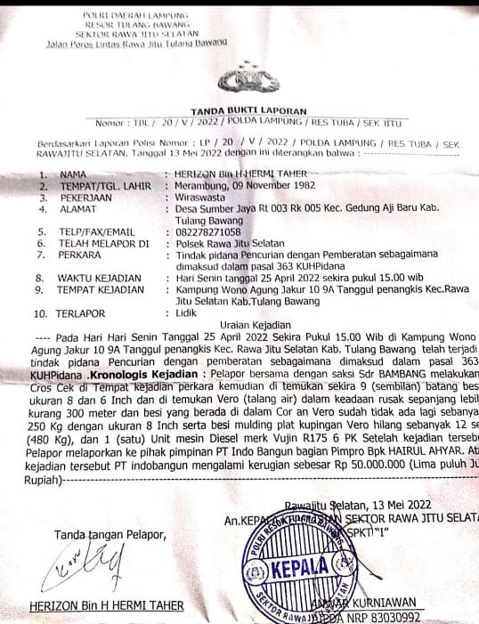 LP/20/ V/2022/ POLDA LAMPUNG/RES TUBA/ SEK RAWAJITI SELATAN, Tanggal 13 Mei 2022.