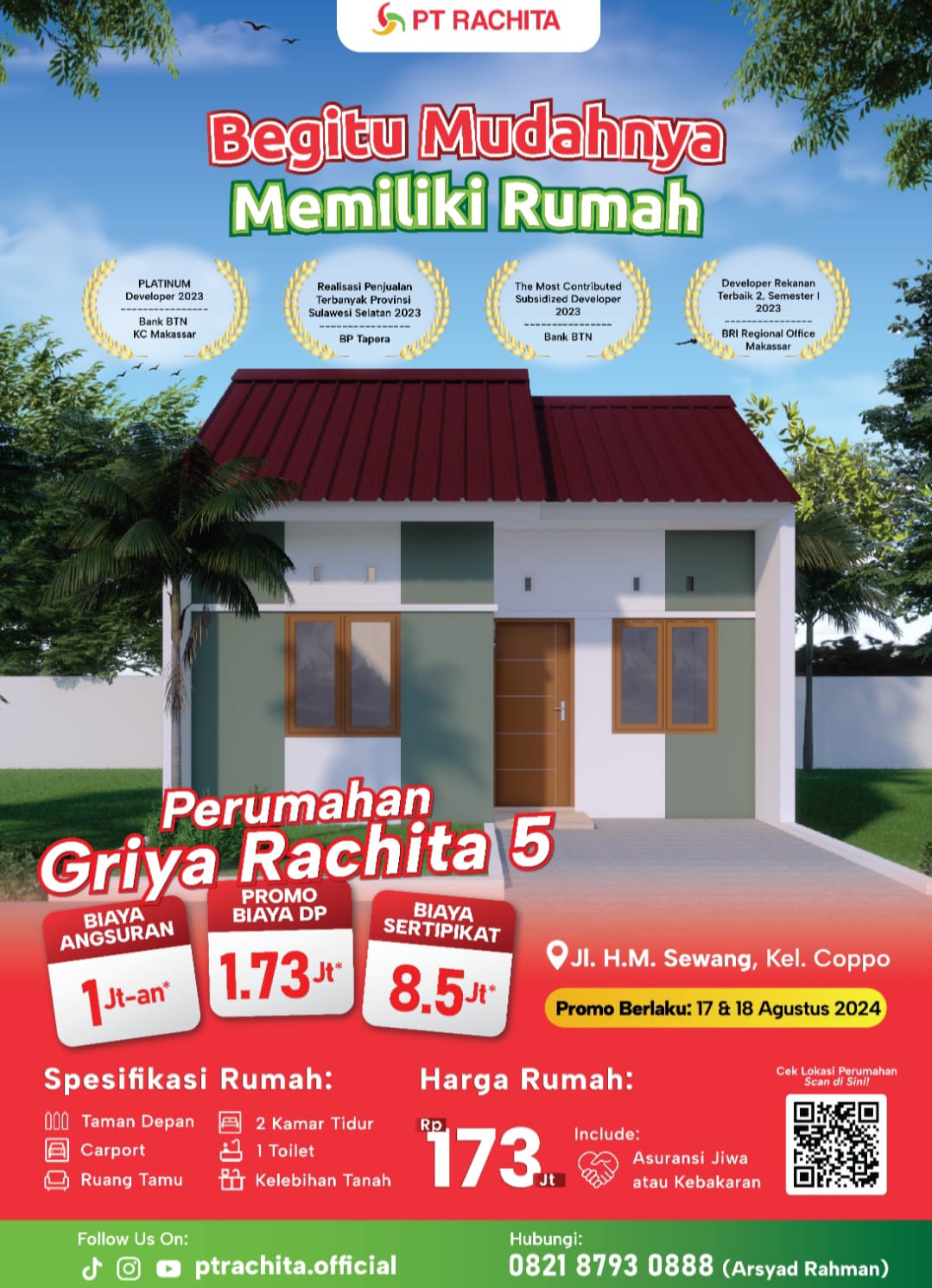 Kali ini, untuk menyemarakkan HUT RI ke 79 Tahun 2024, perumahan Griya Rachita 5 Jalan H. M. Sewang Coppo memberikan promo merdeka bagi masyarakat Kab. Barru untuk mendapatkan kesempatan emas untuk memiliki hunian baru.