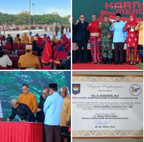 MAKASSAR | Pekan Merdeka Toleransi yang digagas oleh Kakanwil Kemenag Prov. Sulsel Khaeroni berbuah manis. 01 Kemenag Sulsel ini diganjar dengan penghargaan oleh Menteri Dalam Negeri yang diserahkan oleh yang diserahkan oleh La Ode Ahmad Pidana Bolombo, Staf Ahli Menteri Bidang Ekonomi dan Pembangunan.