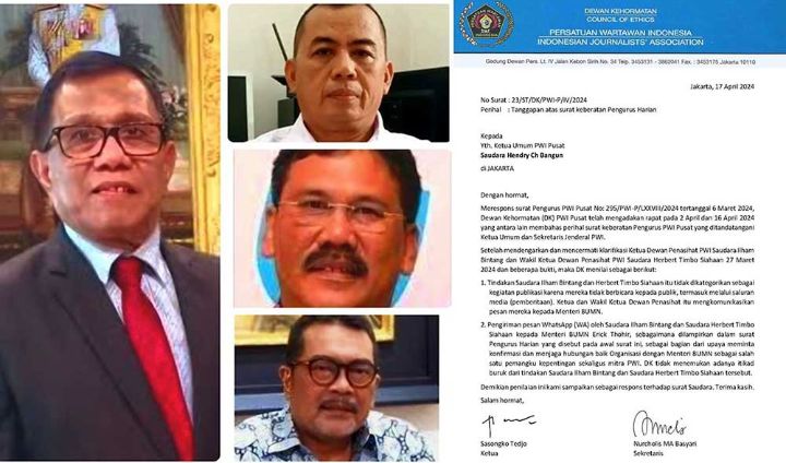Merespons surat Pengurus PWI Pusat No: 295/PWI-P/LXXVIII/2024 tertanggal 6 Maret 2024, Dewan Kehormatan (DK) PWI Pusat telah mengadakan rapat pada 2 April dan 16 April 2024 yang antara lain membahas perihal surat keberatan Pengurus PWI Pusat yang ditandatangani Ketua Umum dan Sekretaris Jenderal PWI.