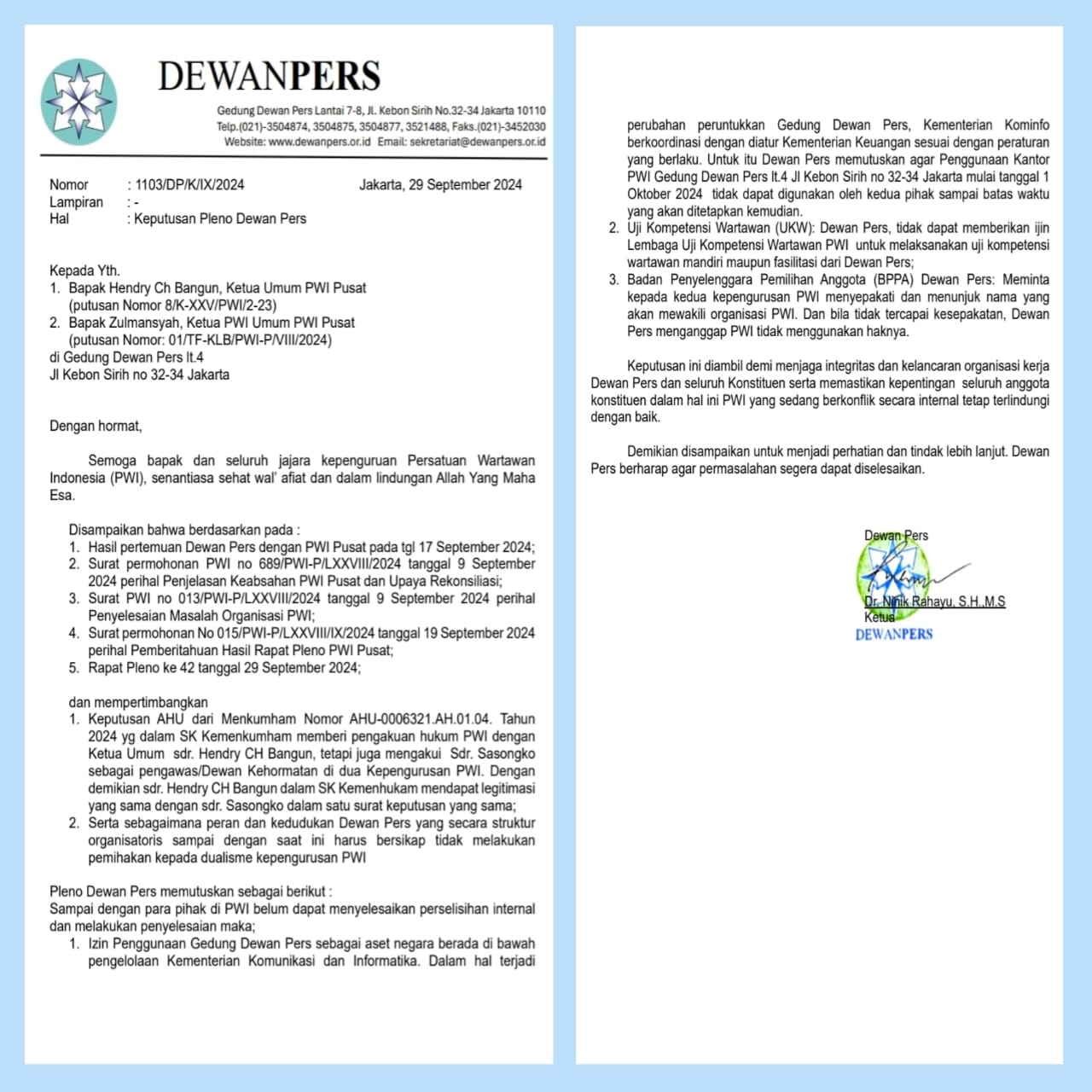 Dari hasil Pleno Dewan Pers ke-42 yang dilaksanakan pada 29 September 2024, Dewan Pers memutuskan: