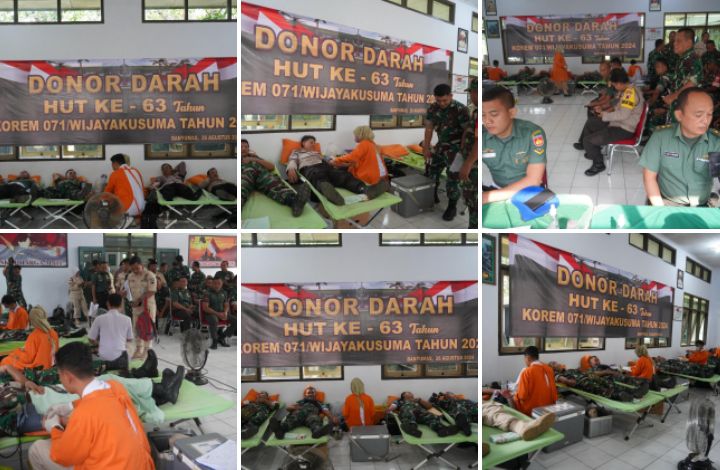 INFOINDONESIAINEWS.COM |BANYUMAS – Ratusan personel gabungan dari berbagai unsur baik prajurit TNI, Polri maupun PNS dan Persit Kartika Chandra Kirana Koorcab Rem 071 PD IV/Diponegoro, donorkan darahnya untuk kemanusiaan. Donor Darah Wijayakusuma Peduli, memperingati hari jadi ke-63 Korem 071/Wijayakusuma berlangsung di Aula Denpal Denpal IV/1 Purwokerto, Banyumas. Senin (26/8/2024).