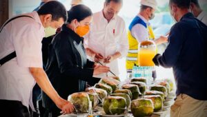 Presiden Jokowi pun mengambil satu kelapa muda, diikuti oleh Ketua DPR RI Puan Maharani, sejumlah menteri yang turut mendampingi, dan para pemimpin redaksi (pemred) media massa nasional maupun media lokal Kalimantan Timur.