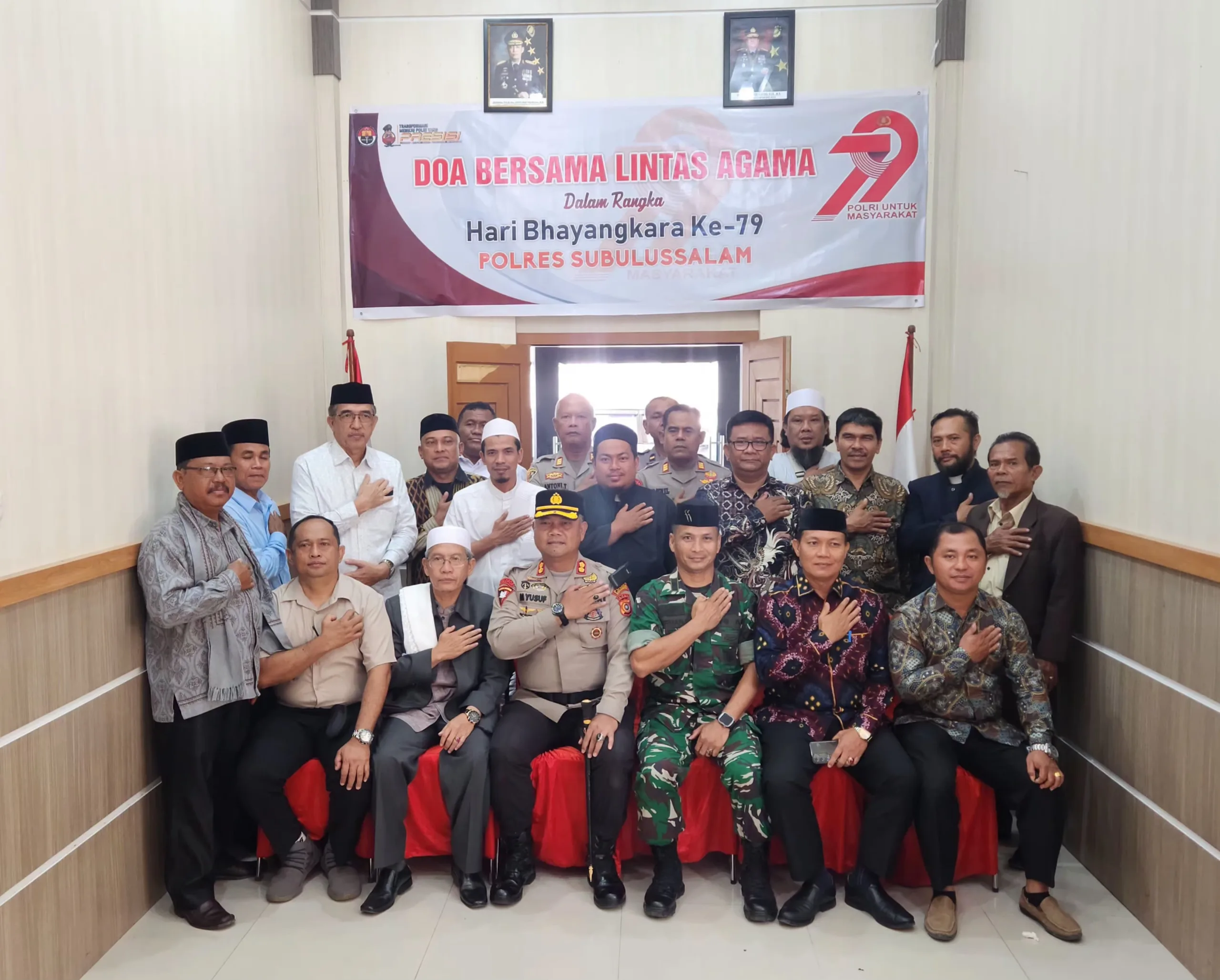 ACEH – Menyambut Hari Bhayangkara ke -79 tahun 2025, Kepolisian Resor Subulussalam melaksanakan Doa Bersama Lintas Agama bertempat di Aula Polres Subulussalam, Kamis, 26 Juni 2025.