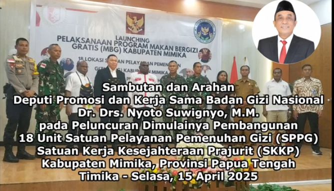 MIMIKA – Kepala Badan Gizi Nasional (BGN), Prof. Dadan Hindayana, diwakili Deputi bidang Promosi dan Kerja Sama BGN, Dr. Drs. Nyoto Suwignyo, M.M., memberikan Sambutan dan Arahan pada Peluncuran Dimulainya Pembangunan 18 Unit Satuan Pelayanan Pemenuhan Gizi (SPPG) yang akan dibangun dan dikelola oleh Dewan Pengurus Daerah Satuan Kerja Kesejahteraan Prajurit (DPD SKKP) Kabupaten Mimika, Provinsi Papua Tengah, bertempat di Ball Room Hotel Grand Tembaga Timika – Selasa, 15 April 2025.