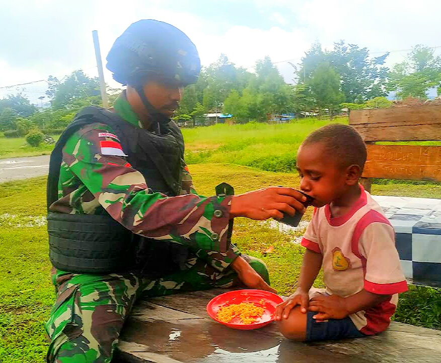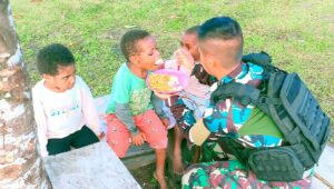 “Sering Personel Satgas Yonif Raider 142/KJ bergiliran untuk menyuapi makan siang kepada anak- anak ini,” jelas Letda Inf Farandika selaku Dantim 1 Pos Kotis Elelim