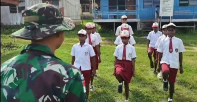 Dalam menyambut upacara peringatan Kemerdekaan Indonesia yang ke-78, Satgas Yonif 310/KK Pamtas RI-Papua, Pos Yabanda melatih dan mengajarkan Pelatihan Baris Berbaris (PBB) untuk pasukan pengibar bendera kepada siswa yang dilaksanakan di Lapangan SD Inpres Yabanda, Distrik Yaffi, Kabupaten Keerom, Papua, Kamis (10/8/2023).