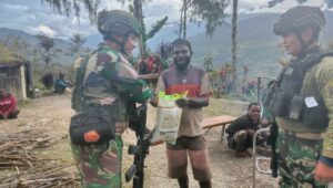 INTAN JAYA | Satgas Yonif Para Raider 305/Tengkorak menyerahkan bantuan sembako berupa beras kepada keluarga Yance Sani yang sedang berduka karena anak kecilnya meninggal dunia Jumat (30/09/22). Rumah duka berlokasi di Kampung Amaesiga, Distrik Sugapa, Intan Jaya, Papua.