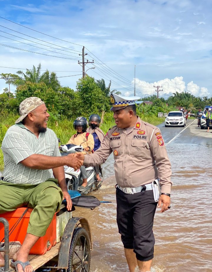 ACEH SINGKIL|Personil Satlantas Polres Aceh Singkil melakukan pengaturan Lalu lintas di daerah rawan banjir di ruas jalan Desa Muara Pea, kKabupaten Aceh Singkil, Sabtu (27/12/2022).