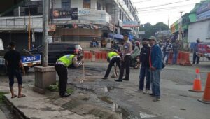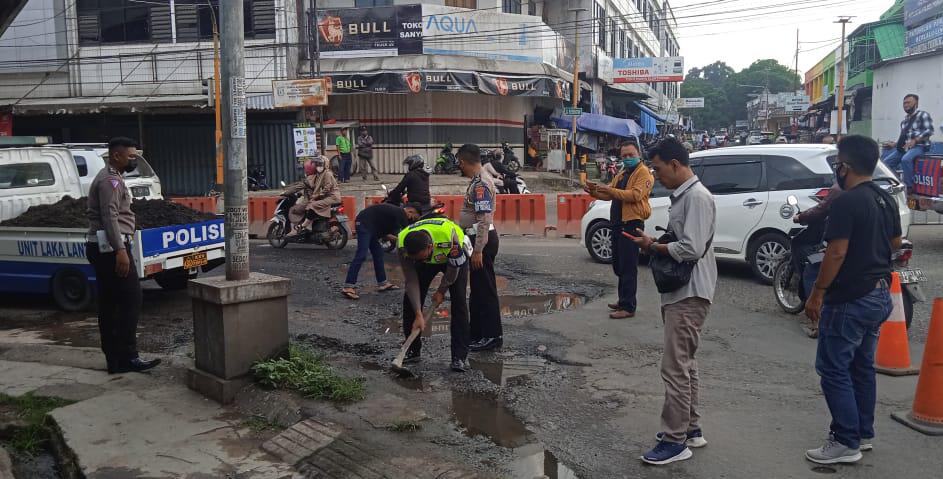 PRINGSEWU | Satlantas Polres Pringsewu pada Hari Senin (14/2/2022) melakukan penimbunan di Ruas Jalan Lintas Barat tepatnya di perempatan lampu merah depan Pos Lantas Polres Pringsewu.