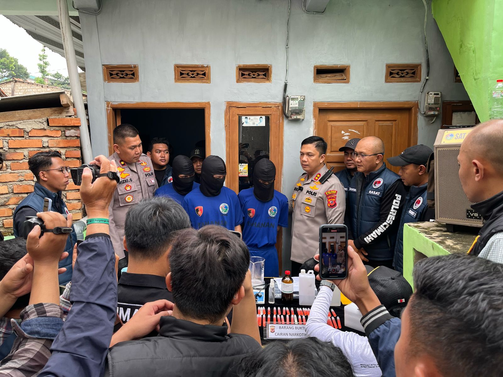 “Saat ini kami berada di salah satu rumah di kawasan Padasuka. Rumah ini diduga digunakan sebagai home industry tempat produksi, penjualan, tempat menyimpan dan menawarkan narkotika golongan satu jenis cairan,” ungkap Kapolres.