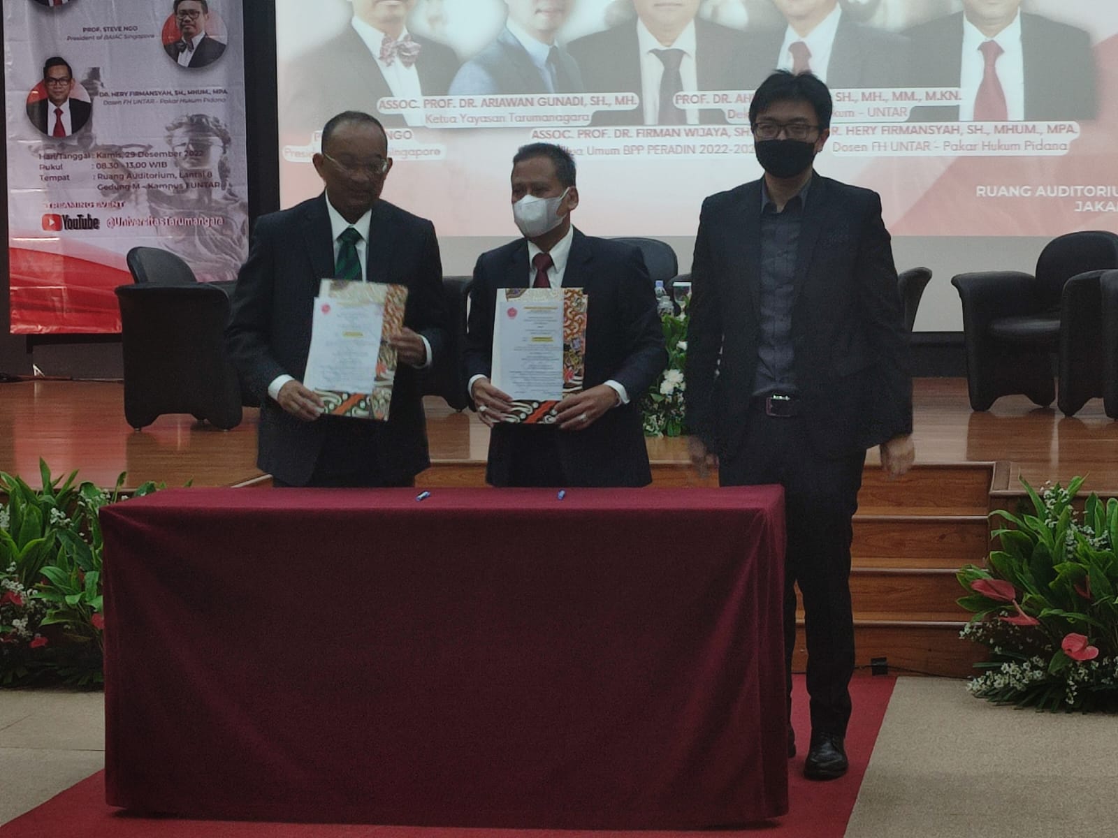 JAKARTA | Badan Pengurus Pusat (BPP) Persatuan Advokat Indonesia (Peradin) bekerja sama dengan Universitas Tarumanagara (Untar) menyelenggarakan Seminar Nasional bertema “Catatan Akhir Tahun 2022” di ruang Auditorium, Lantai 8 Gedung M-Kampus 1 Untar, Jl. Letjen. S Parman No. 1, Jakarta Barat, Kamis (29/12/2022). Seminar nasional ini dihadiri Ketua Umum (Ketum) BPP Peradin, ASSOC. Prof. DR. Firman Wijaya, SH., MH, ASSOC. Prof. DR. Ariawan Gunadi, SH., MH (Ketua Yayasan Tarumanagara), Prof. Steve Ngo (President Of BAIAC Singapura), Prof. DR. Ahmad Sudiro, SH., MH., MM., M.KN (Dekan Fakultas Hukum Untar), DR. Hery Firmansyah, SH., MHum., MPA (Dosen FH Untar-Pakar Hukum Pidana).