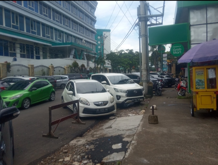 Larangan menggunakan bahu jalan sebagai tempat parkir sepertinya tak berlaku di lokasi tersebut, pasalnya setiap hari kendaraan roda dua dan roda empat terlihat terparkir dengan rapi di bahu Jalan, hal tentu telah berlawan dengan aturan larangan parkir di bahu jalan.