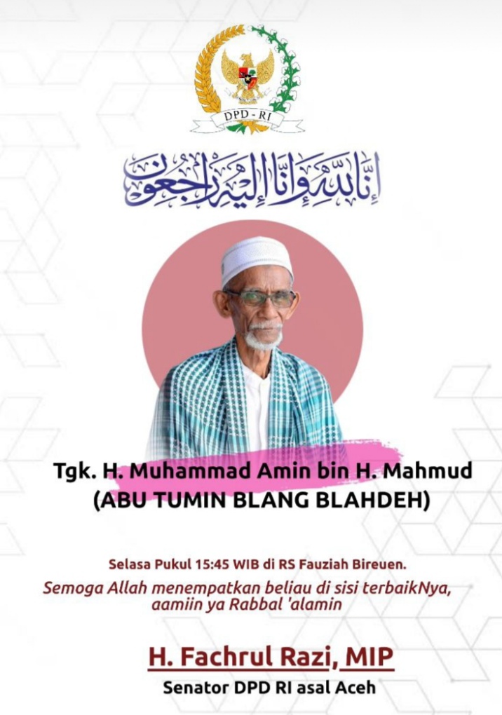 “Abu Tumin Blang Blahdeh adalah seorang Ulama Kharismatik yang merupakan penerang bagi rakyat Aceh. Saya turut berdukacita yang sangat dalam atas berpulangnya Abu Tumin,” ucapnya.