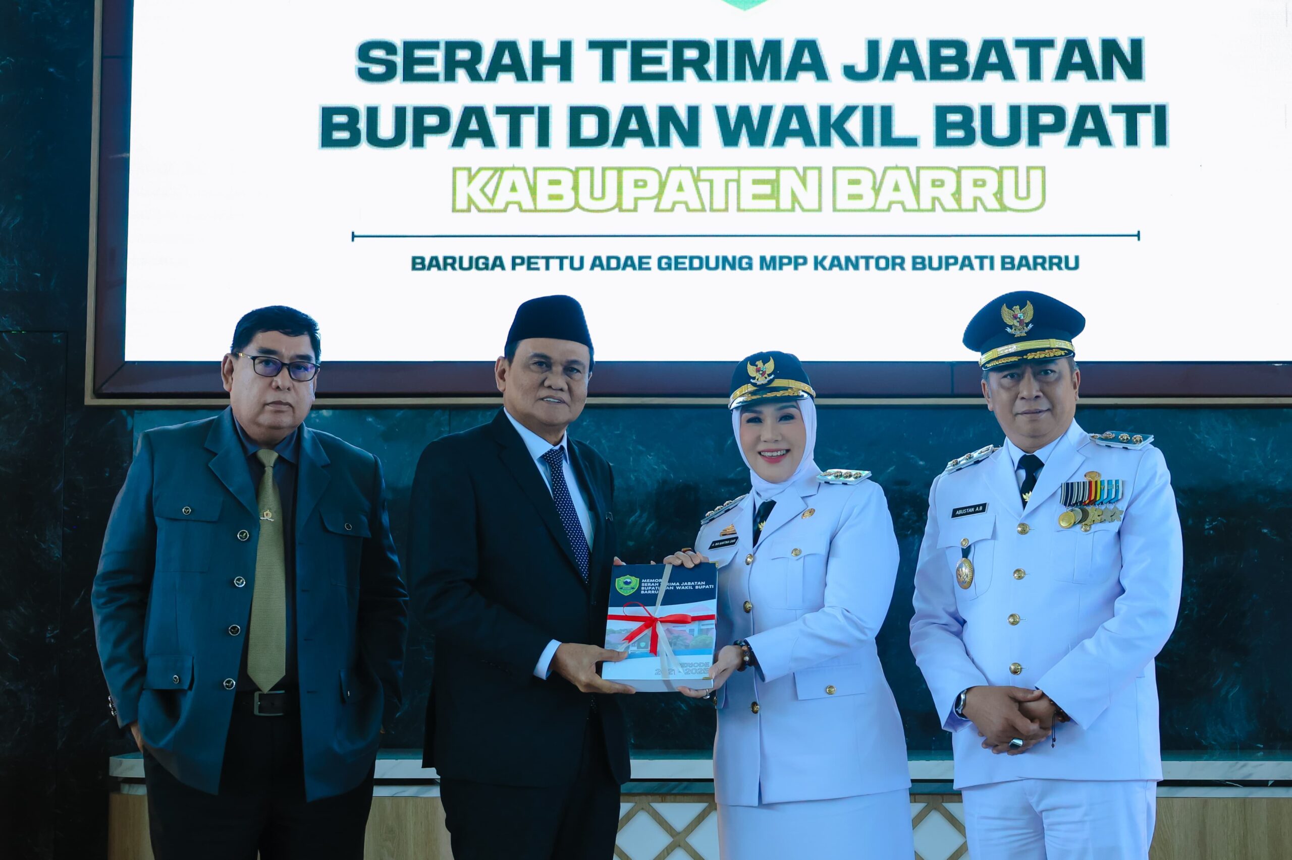 BARRU – Serah terima jabatan (Sertijab) Bupati/Wakil Barru (periode 2021- 2025) Ir. H. Suardi Saleh, M. Si – Aska Mappe, SH kepada Bupati/Wakil Bupati Barru (periode 2025 – 2030), Andi Ina Kartika Sari, SH. M. Si, -Dr. Abustan A. Bintang, M. Si berlangsung dilantai VI Menara MPP Kantor Bupati Barru, Rabu 5/3/2025.