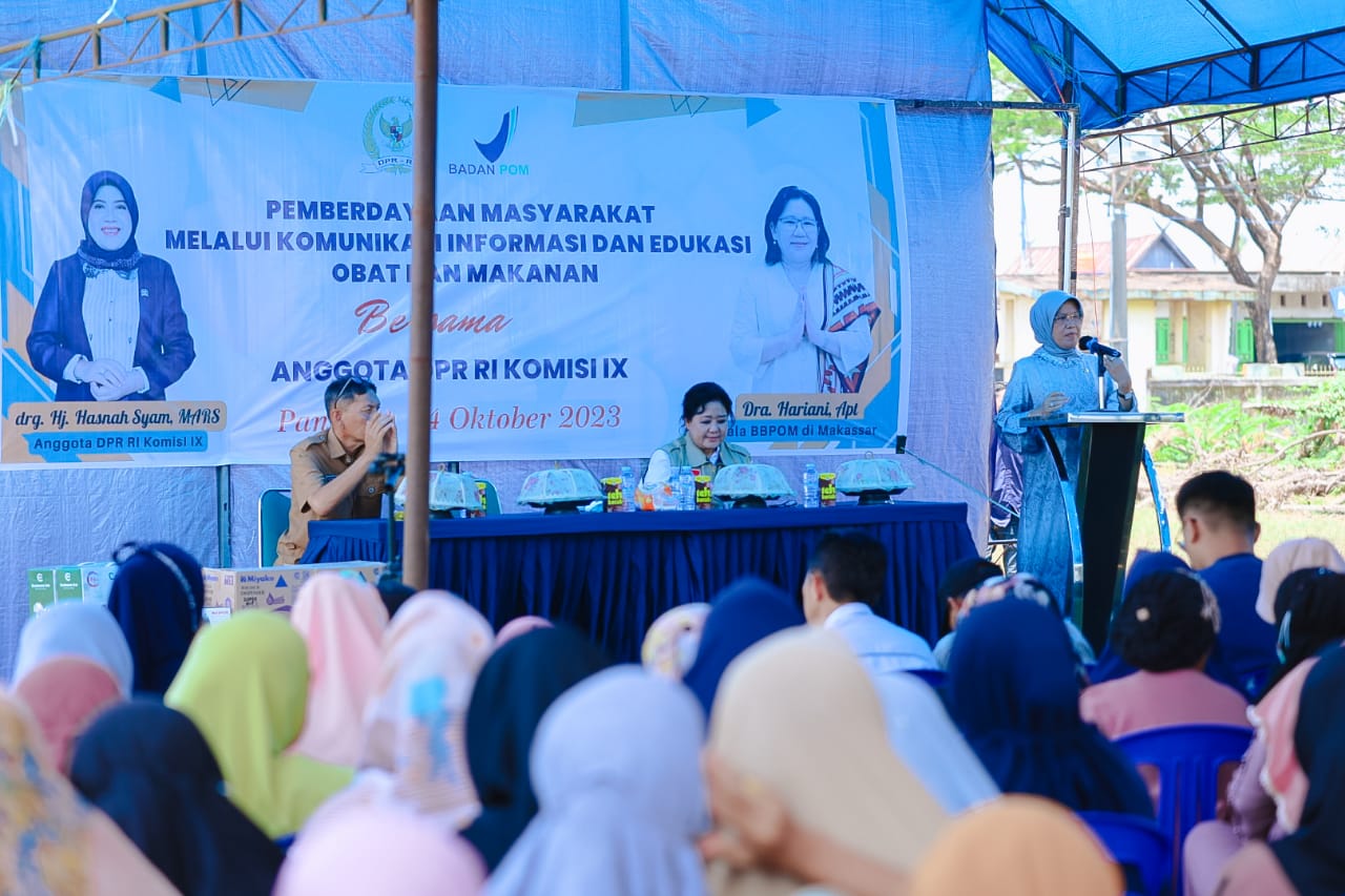 MA’RANG | Anggota DPR RI Komisi IX Fraksi NasDem drg. Hj. Hasnah Syam, MARS., bekerjasama dengan Badan Pengawasan Obat dan Makanan (BPOM) menggelar sosialiasi melalui komunikasi informasi dan edukasi (KIE) obat, makanan dan kosmetik, di lapangan Laikang, kecamatan Ma’rang, kabupaten Pangkep, Sulawesi Selatan, pada Selasa (24/10/2023).