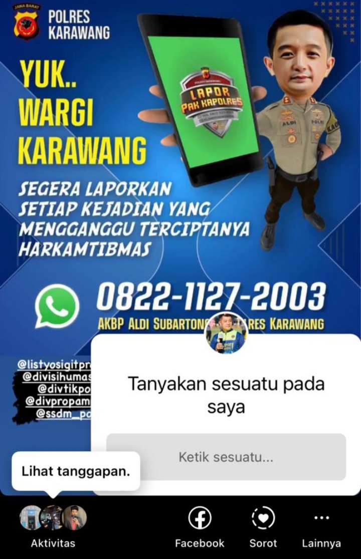 ‘Lapor Pak Kapolres’ ini bisa diakses masyarakat dengan cara yang lebih cepat dan sederhana, masyarakat tinggal WhatsApp di nomor 0812-1127-2003, keluhan apapun bisa dilayani. Bahkan ada juga yang melapor melalui direct message Instagram dan itu akan langsung direspon oleh Polres Karawang.