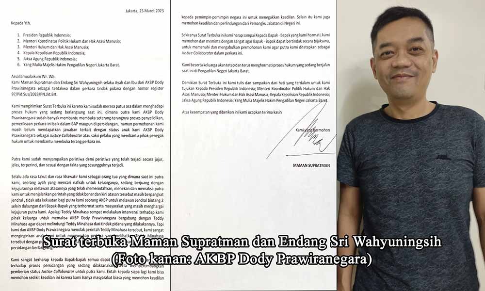 Kami mengirimkan surat terbuka ini karena kami sudah merasa putus asa dalam menghadapi proses hukum yang berlangsung saat ini, dimana putra kami AKBP Dody Prawiranegara sudah banyak membantu membuka seterang-terangnya proses penyelidikan, pemeriksaan perkara ini, baik dalam BAP maupun di persidangan, namun permohonan kami masih belum mendapatkan jawaban terkait dengan status anak kami AKBP Dody Prawiranegara sebagai Justice Collaborator atau saksi pelaku yang membantu pihak penegak hukum untuk membantu membuka terang perkara ini.