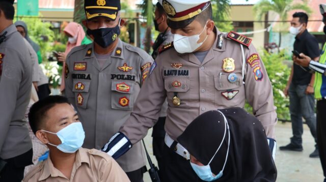“Saat Mau Disuntik, Ga Usah Dilihat Ya Nak” Ucap Kapolres Madina Kepada Siswa Dan Siswi Yang Akan Di Vaksin.
