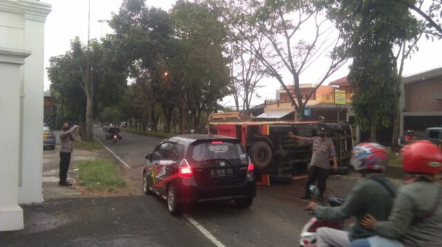 Truk Pasir Pecah Ban dan Terguling, Polsek Cibeureum Lakukan Pengaturan Lalu lintas