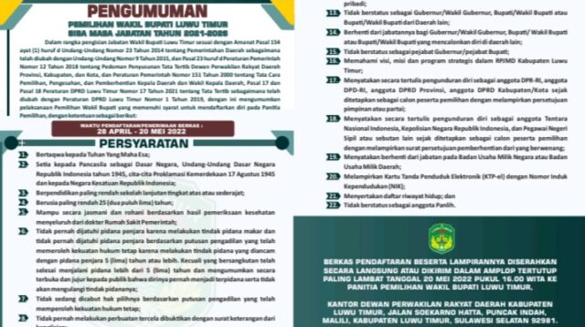 INFO :”Pengumuman Pendaftaran Calon Wakil Bupati Luwu Timur, Baca dan Catat Tanggal,serta Informasinya yaa”..!