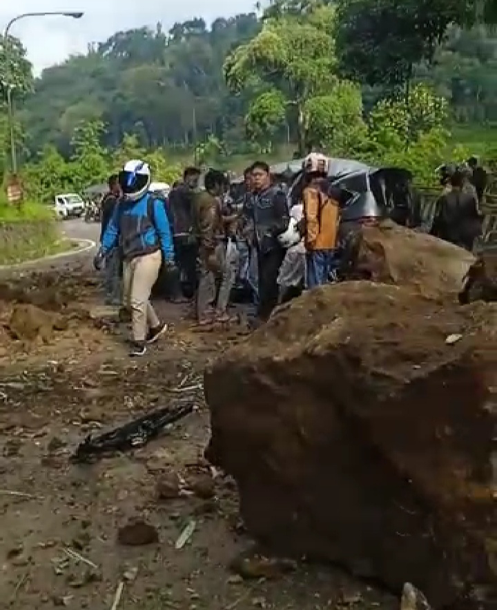Longsoran tanah bercampur batu menutup badan jalan sehingga mengakibatkan arus Bandung – Cirebon begitu juga sebaliknya macet total.