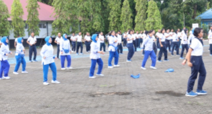 TNI AL, MAKASSAR | Komandan Lantamal VI (Danlantamal VI) Makassar Brigjen TNI (Mar) Amir Kasman, S.E., M.M., bersama Ketua Korcab VI DJA II Ny. Dewi Amir Kasman melaksanakan olahraga bersama dengan Personel Prajurit dan PNS Lantamal VI di Lapangan Apel Arafuru Mako Lantamal VI, Jum’at (25/11/2022).
