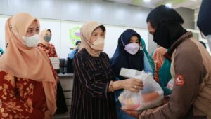 BARRU | Ketua Tim Penggerak PKK Kabupaten Barru drg. Hj. Hasnah Syam, MARS menyerahkan paket sembako untuk 370 orang petugas kebersihan, tukang ojek dan tukang becak.