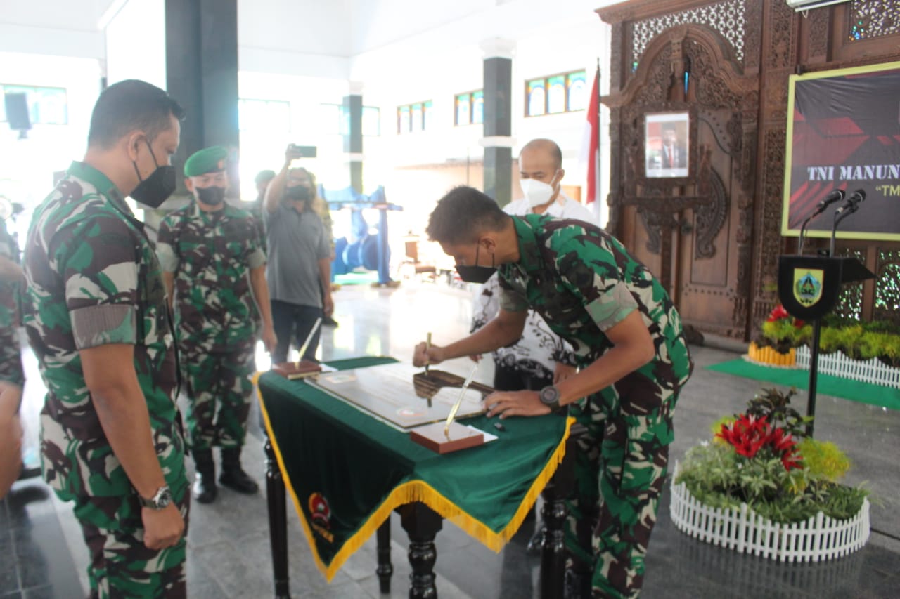 PEMALANG | Danrem 071/Wijayakusuma, Kolonel Inf Yudha Airlangga, S.E., yang juga selaku PKP (Penanggungjawab Keberhasilan Pelaksanaan) hadiri dan saksikan penyerahan hasil TMMD ke-113 Kodim 0711/Pemalang di Pendopo Pemkab Pemalang, Kamis (9/6/2022).