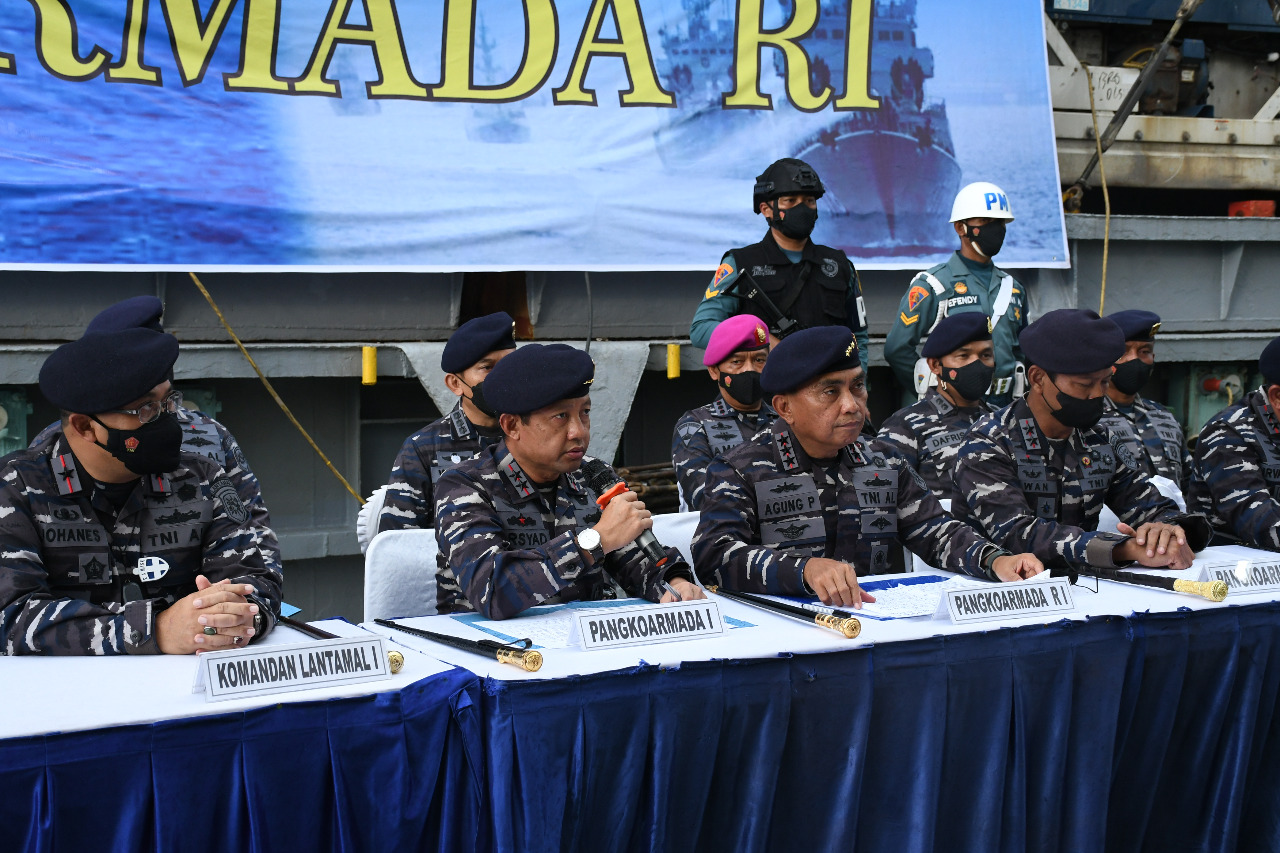 Panglima Komando Armada Republik Indonesia (Pangkoarmada RI) Laksamana Madya TNI Agung Prasetiawan saat menggelar konferensi pers didampingi Pangkoarmada I Laksamana Muda TNI Arsyad Abdullah, Pangkoarmada II Laksamana Muda TNI Iwan Isnurwanto dan Pangkoarmada III Laksamana Muda TNI Irvansyah, Kadispenal Laksamana Pertama TNI Julius Widjojono serta Komandan Lantamal I Laksamana Pertama TNI Johanes Djanarko Wibowo, di Dermaga BICT Belawan, Jumat (06/5) mengatakan bahwa di bawah kepemimpinan Kepala Staf Angkatan Laut (Kasal) Laksamana TNI Yudo Margono, TNI AL selaku institusi penegakkan hukum dan kedaulatan di laut dengan serius mencegah, menjaga dan menindak segala bentuk kegiatan ilegal di dan atau lewat laut.
