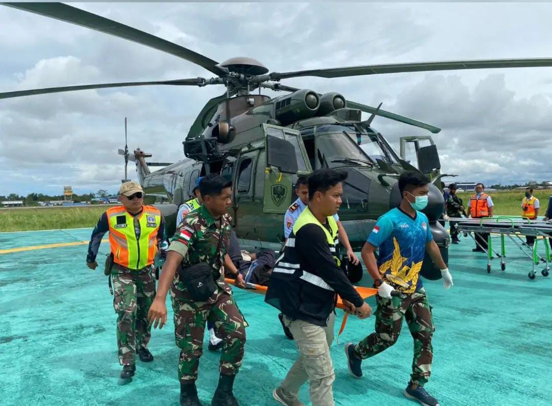 Proses evakuasi menggunakan Helikopter EC-725 Caracal Skadron Udara 8 Wing 4 Lanud Atang Sendjaya Bogor.
