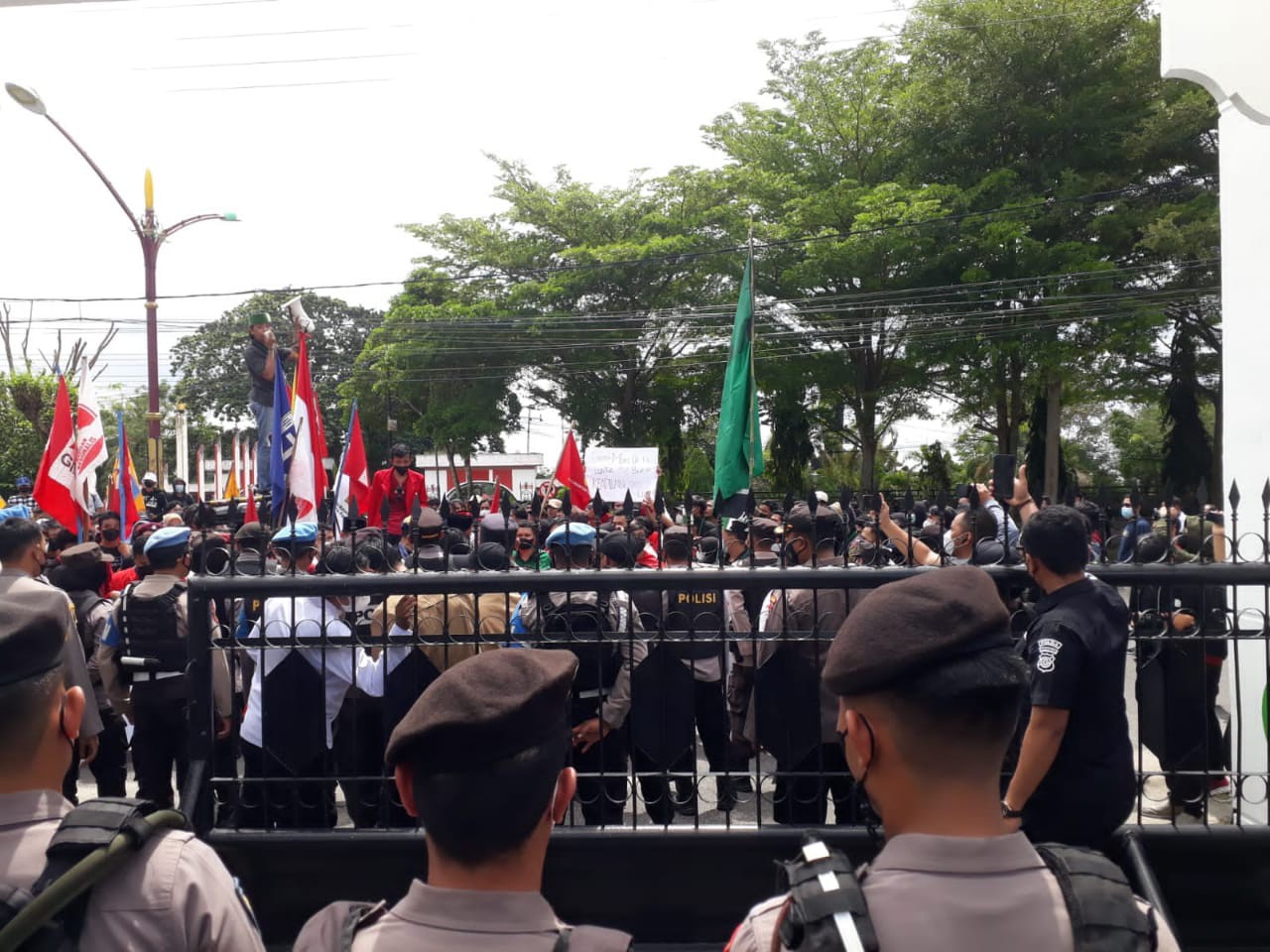 PALANGKA RAYA |Anggota Komando Distrik Militer (Kodim) 1016/Palangka Raya membantu pengamanan mengirimkan bantuan untuk pengamanan Aksi Damai, yang dilakukan di depan Kantor DPRD Provinsi Kalimantan Tengah, Senin (11/04/2022).