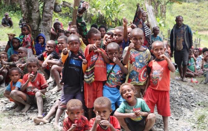 Anak-anak yang mengetahui kedatangan rombongan TNI-POLRI ternyata bukan hanya menyambut, namun ikut membantu memikul beberapa batang kayu bakar. Tegur sapa, senyum dan salam menghiasi suasana pagi di tempat berkumpulnya keluarga besar Fam Sani dari berbagai kampung. Rombongan Raja Aibon kemudian langsung berbaur, sekaligus membantu menyiapkan kebutuhan acara bakar batu. Bekal gula-gula dibagikan ke anak-anak, rokok diberikan kepada warga dewasa, sedangkan Dokter bersama timnya menggelar perlengkapan medis untuk memberikan pelayanan kesehatan. Indah sekali suasana di Kampung Hengki Sani.