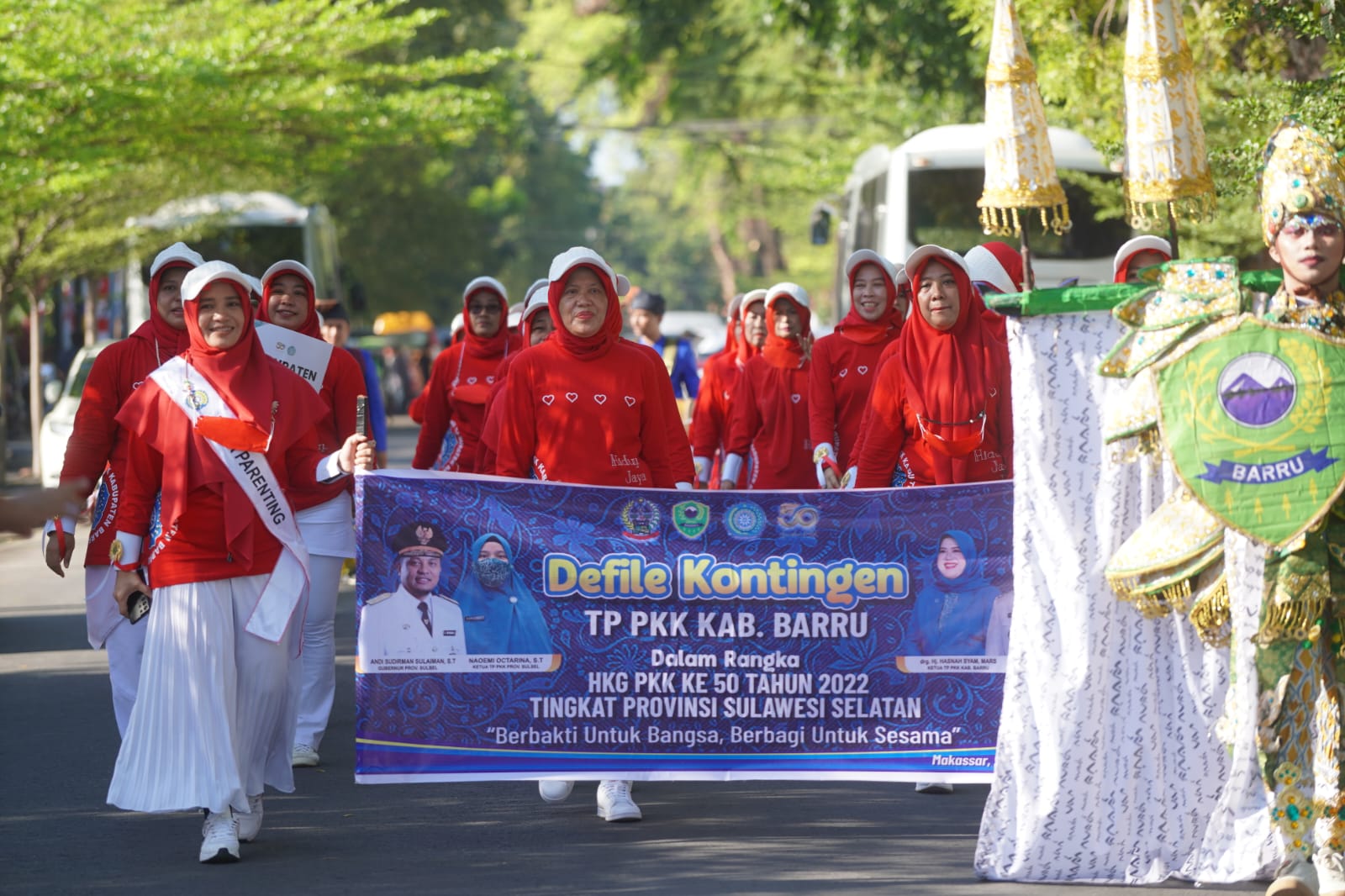 Kontingen Kab. Barru tampil segar dan mempesona menggunakan kostum nuansa merah putih diapit oleh seorang wanita tampil dengan busana bak We Cudai, sementara lelakinya menggunakan simbol tugu payung.