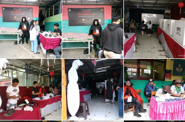 INFOINDONESIAINEWS.COM | Tempat Pemungutan Suara (TPS) 37 Desa Margajaya , Kecamatan Ngamprah, tampak berbeda dari TPS biasanya. TPS tersebut terbilang unik, lantaran dihiasi dengan suasana mistik yang bertemakan “Sarang Hantu”ini nampak terlihat adanya Gondorewo, pocong, kuntilanak , Vampire, dan Mayat yang tergeletak diatas bangkar, hingga menambah seramnya situasi TPS 37 tersebut.